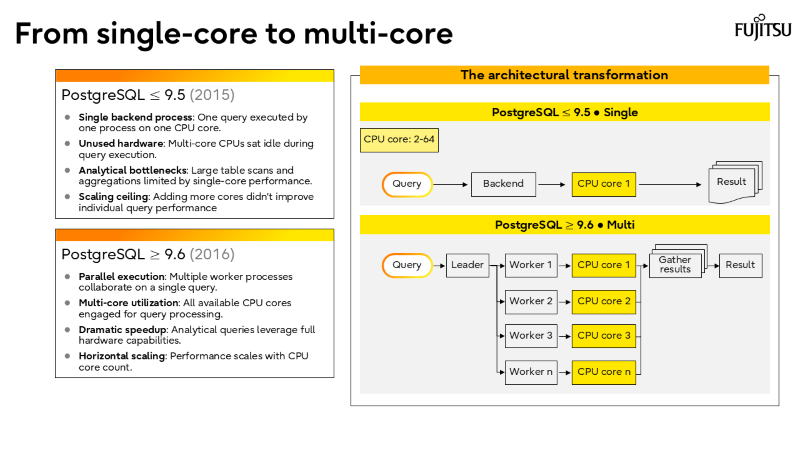 From PostgreSQL 9.6 onward, multi-core utilization is a game-changer for analytics.