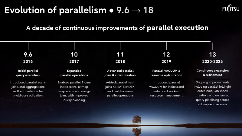 From PostgreSQL 9.6’s first parallel execution to PostgreSQL 18’s self-join elimination and asynchronous I/O.
