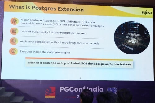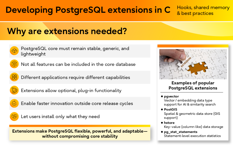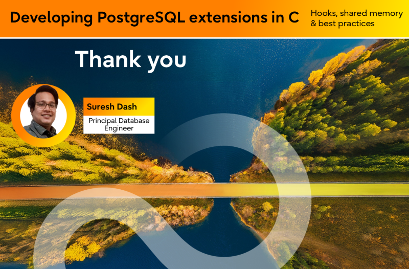 My session focused on how PostgreSQL can be extended using C to build high performance, deeply integrated features without modifying the core database engine. The emphasis was on understanding extension development as a first class mechanism within PostgreSQL—one that allows developers to hook into core execution paths, share state across backends, and run asynchronous processing while remaining aligned with upstream design principles.