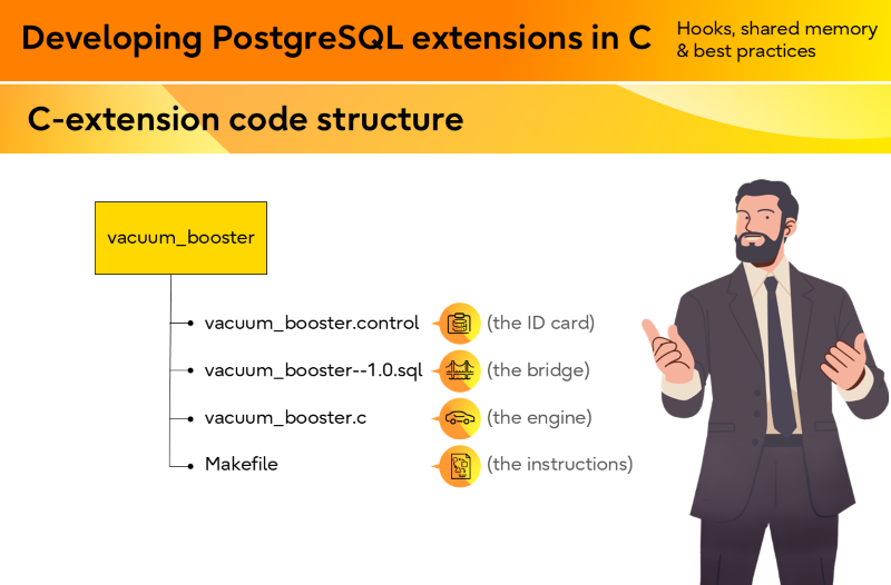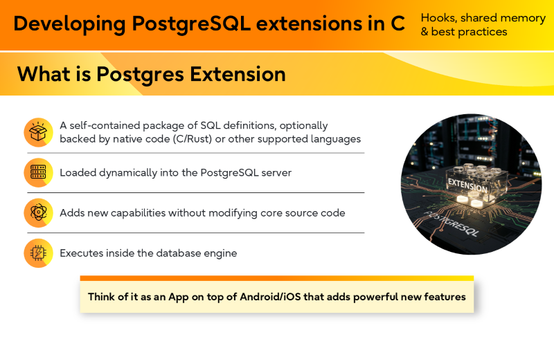 I covered the fundamentals of extension development, including how extensions are structured, how and when they are loaded into the PostgreSQL server, and how they interact with internal components such as hooks, shared memory, and background workers.