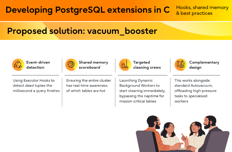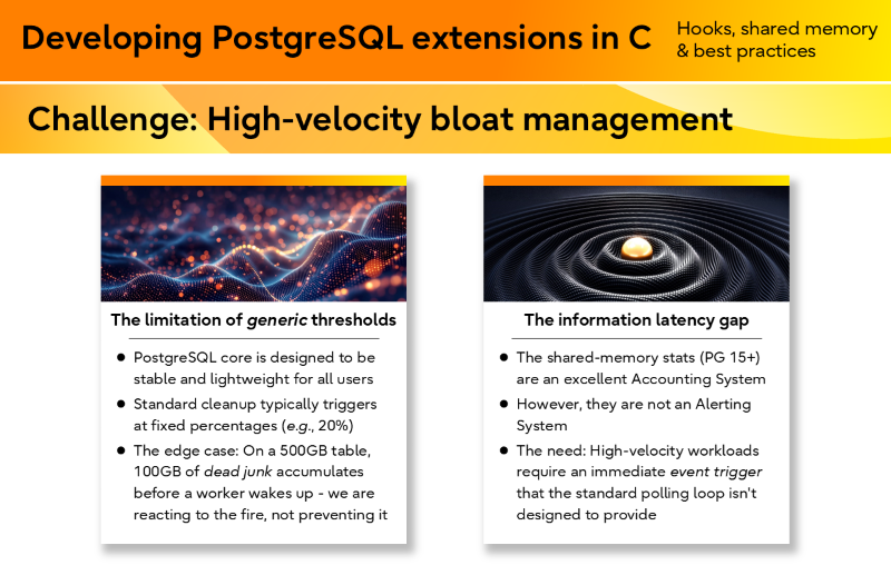 The session also introduced a conceptual idea called vacuum_booster, which explores improving vacuum responsiveness in high-velocity workloads by detecting heavy update activity earlier and triggering more proactive cleanup.
