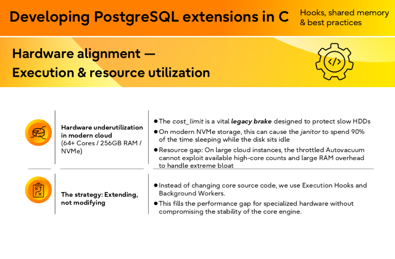The session distilled several practical takeaways for developers looking to work closer to PostgreSQL internals and build reliable, production‑grade extensions without compromising stability. The focus was on understanding how extensions interact with core subsystems, the constraints imposed by PostgreSQL’s process model and memory architecture, and the design considerations required to build extensions that remain correct, observable, and maintainable under real‑world concurrency and workload pressure.