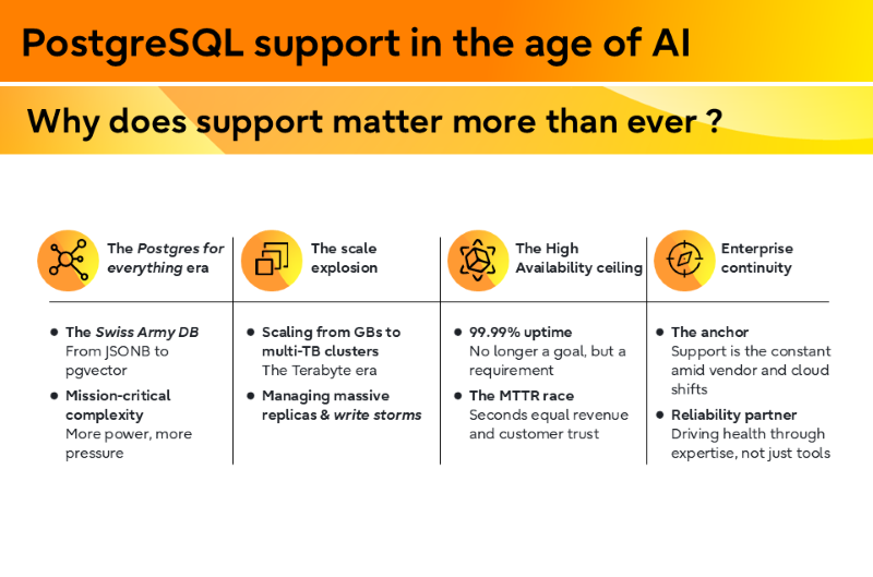 In this session , I shared how despite rapid innovation, fragmented troubleshooting has created a progress paradox: a smarter database with harder and slower day to day operations, and also how strong, effective support now directly shapes MTTR, customer trust, and long term confidence in PostgreSQL at scale