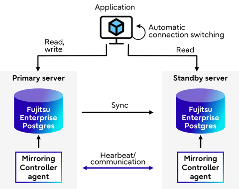 The Mirroring Controller is a module within Fujitsu Enterprise Postgres that continually monitors the system to switch online transaction processing to a standby server seamlessly in case an abnormality is detected.