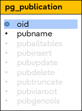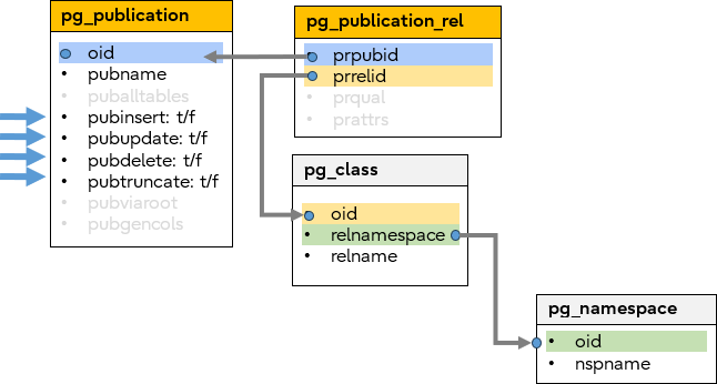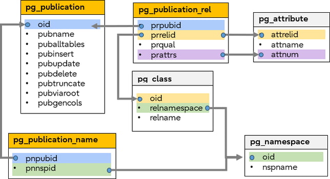 These are linked together as shown in the following diagram. Every kind of Publication can be represented by these catalogs, but note that not all catalogs are required for all CREATE PUBLICATION commands – e.g., the pg_publication_namespace is only used to describe a FOR TABLES IN SCHEMA publication.
