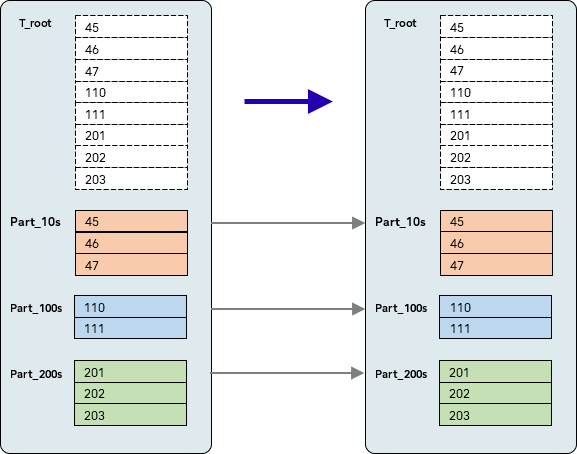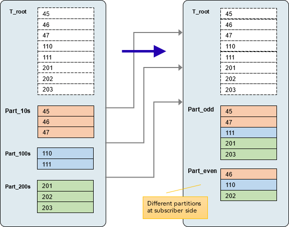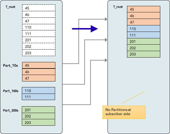 In the second example below the parameter is true still, but now the subscriber root table is not a regular table – it too is a partitioned table. Notice that because replication is through the T_root, the subscriber-side partitions here are different to those on the publisher.