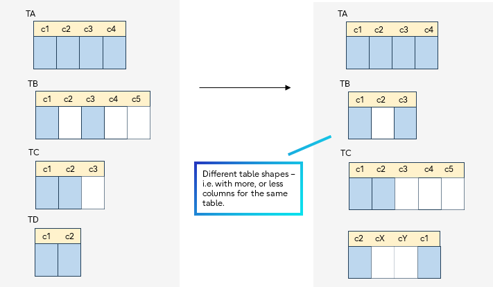 This means different shape tables are possible at each side of the replication. For example, valid subscriber table variations include: